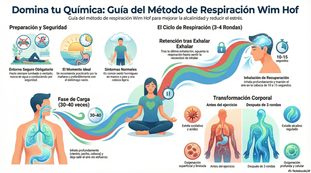 Inhalación de recuperación | Realizar una inhalación profunda y retener el aire mientras se aplica una ligera presión hacia la zona de la cabeza. | 10 a 15 segundos | Recarga de oxígeno inmediata y sensación de euforia (“drogado con tu propio suministro”). | Repetir el ciclo completo de 3 a 4 rondas por la mañana antes del desayuno para mejores resultados. | Restablecimiento rápido de los niveles de oxígeno y estabilización del pH sanguíneo. | [1] |